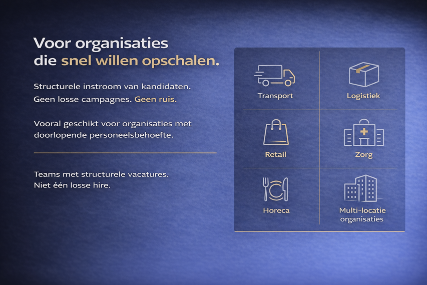 Onze aanpak is vooral geschikt voor organisaties die wekelijks nieuwe medewerkers nodig hebben, continu vacatures open hebben of snel moeten kunnen opschalen. Niet voor losse hires, maar voor structurele instroom.