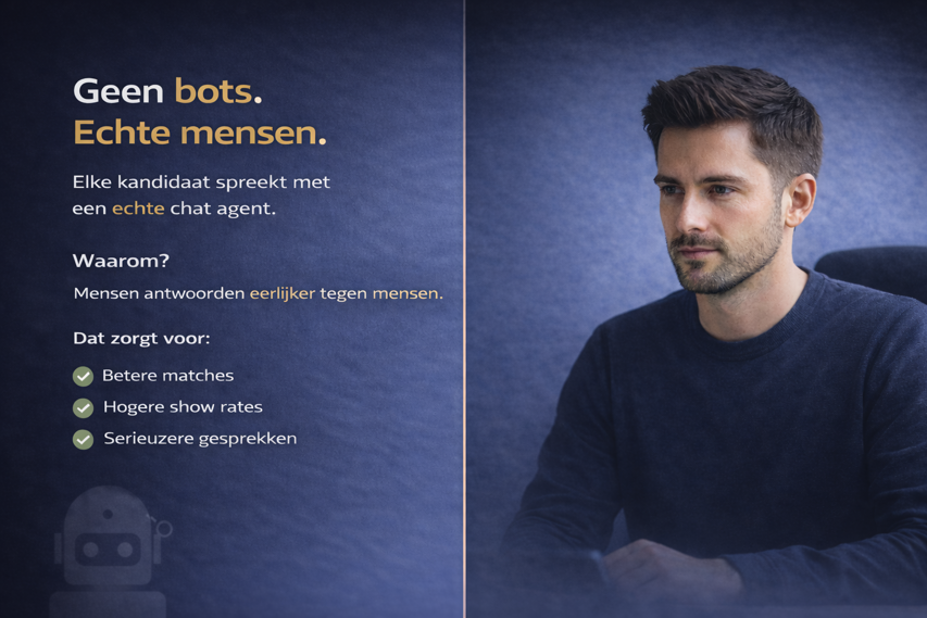 Elke kandidaat wordt persoonlijk benaderd en gesproken via WhatsApp. Geen standaardformulieren, geen geautomatiseerde antwoorden, maar direct contact. Dat zorgt voor betere matches, hogere show rates en serieuzere gesprekken.